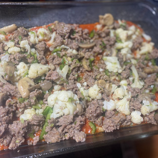 Ingredients: 14 ounces Cauliflower florets cut into bite-size pieces ( I used Frozen and turned out great) ½ teaspoon Salt 2.5 ounces Pepperoni 2 pounds Italian Sausage if in casings remove from casing before cooking 1 tablespoon Olive Oil 8 ounces Mushrooms sliced 1 Green Pepper cut into bite-size pieces 12 ounces Mozzarella cheese shredded 1.5 cups Low Carb Pasta Sauce I used Rao’s Homemade Marinara 1/4 cup Parmesan cheese powdered 1 teaspoon Italian Seasoning